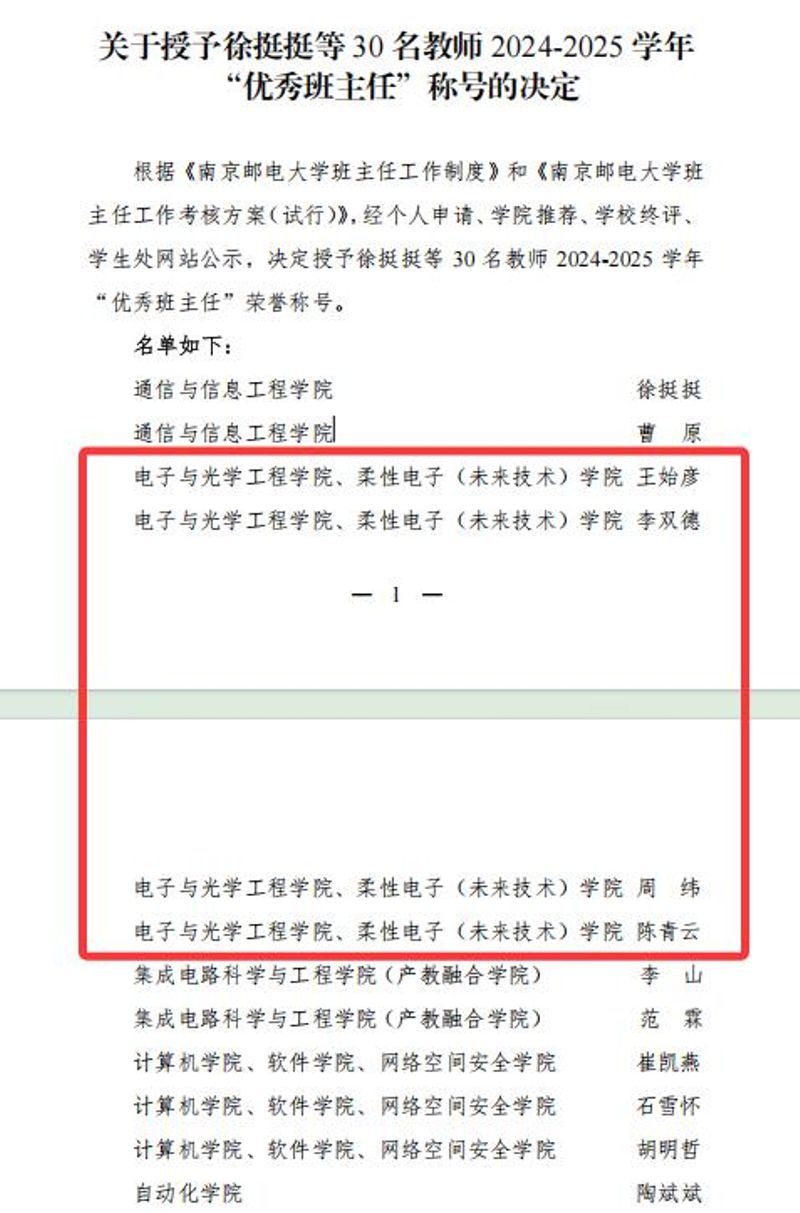 近日,南京郵電大學(xué)2024-2025學(xué)年“優(yōu)秀班主任”評(píng)選結(jié)果正式揭曉。全校共30位教師獲此殊榮,其中,電子與光學(xué)工程學(xué)院、柔性電子(未來(lái)技術(shù))學(xué)院共有四位教師光榮入選,分別是王始彥、李雙德、周緯、陳青云。本次評(píng)選注重學(xué)生的真實(shí)反饋,根據(jù)“學(xué)生評(píng)價(jià)情況”(即班主任工作測(cè)評(píng)分?jǐn)?shù))和班主任提交的各類履職材料,對(duì)各位班主任老師的履職情況進(jìn)行綜合評(píng)定,最終擇優(yōu)入選。電光柔院此次能夠有四位教師脫穎而出,榮獲校級(jí)“優(yōu)秀班主任”稱號(hào),是學(xué)校對(duì)學(xué)院班主任工作整體水平和育人實(shí)效的高度認(rèn)可。入選老師在日常工作中,始終堅(jiān)守育人初心,恪盡職守,在思想引領(lǐng)、學(xué)業(yè)指導(dǎo)、生涯規(guī)劃、班級(jí)管理等方面傾注了大量心力,贏得了學(xué)生一致好評(píng)。此次優(yōu)異成績(jī)的取得是學(xué)院長(zhǎng)期以來(lái)堅(jiān)持立德樹人根本任務(wù)、不斷加強(qiáng)和改進(jìn)班主任工作的成果體現(xiàn)。電光柔院將以此為契機(jī),持續(xù)深化班主任隊(duì)伍建設(shè),充分發(fā)揮優(yōu)秀班主任的示范引領(lǐng)作用,不斷探索學(xué)生工作的新思路、新方法,努力提升人才培養(yǎng)質(zhì)量,為學(xué)生的全面成長(zhǎng)成才和學(xué)校的高質(zhì)量發(fā)展做出更大貢獻(xiàn)。撰稿:祝騰審核:徐磊編輯:祝騰